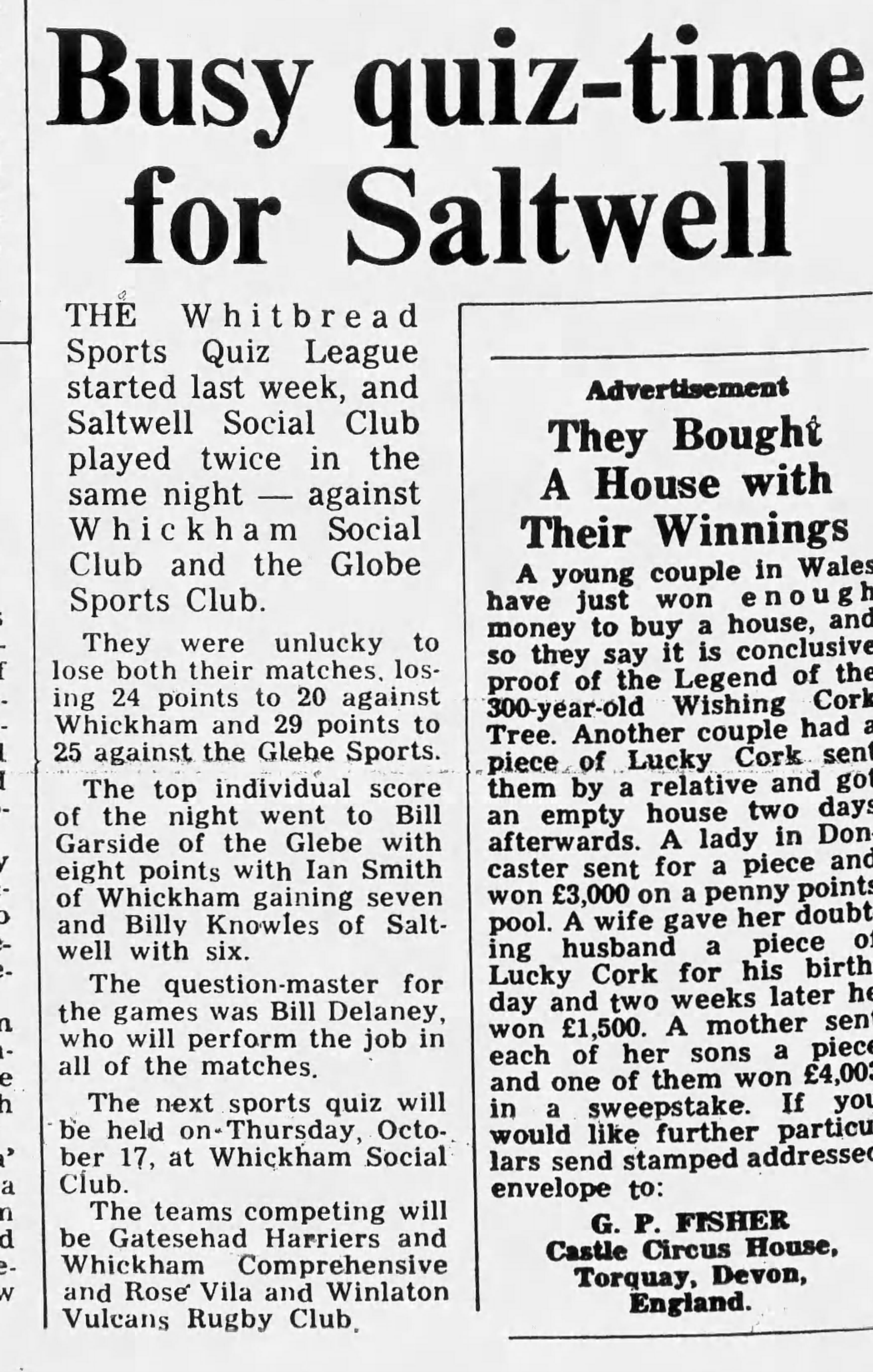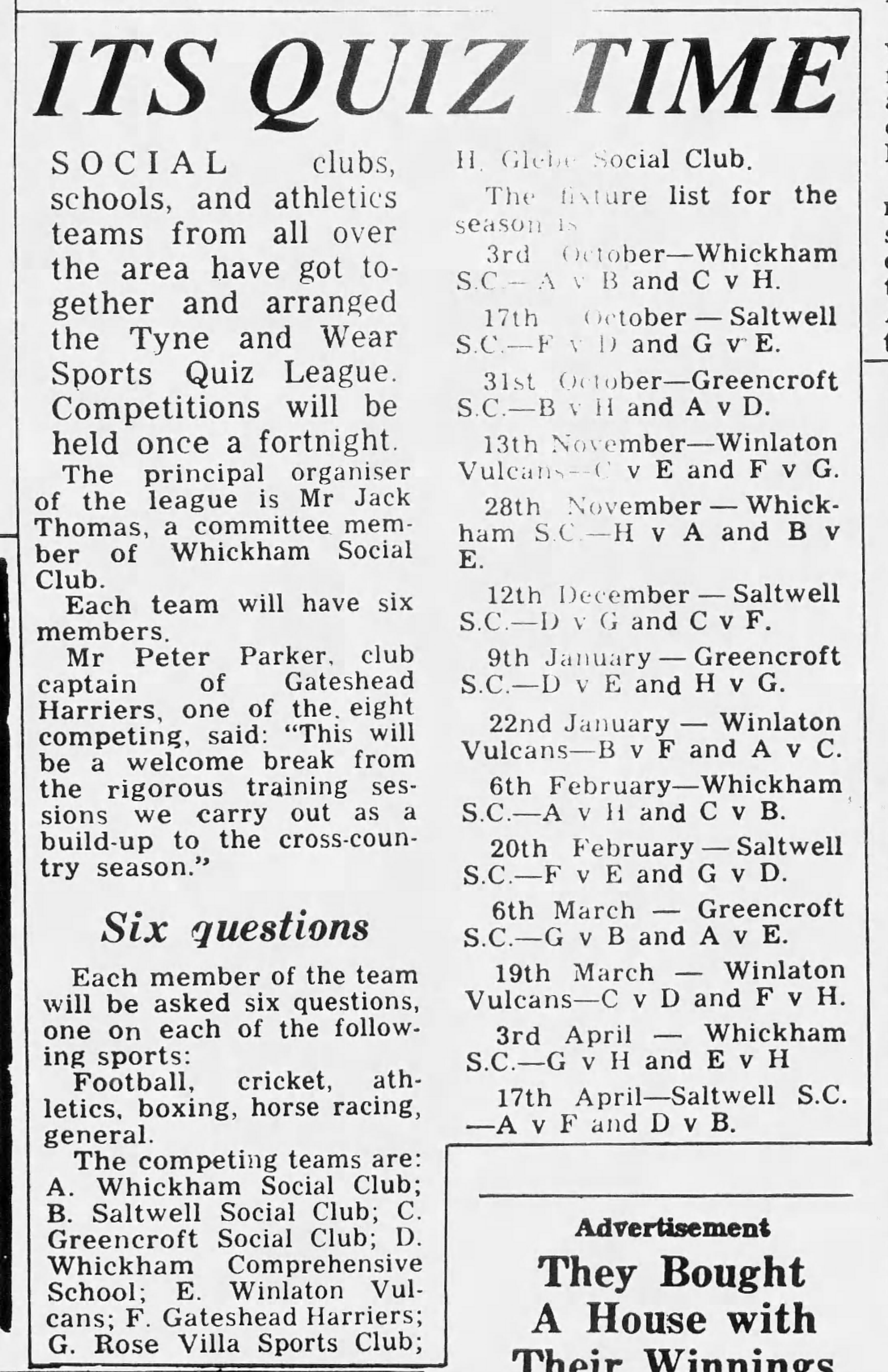 The first ever Sports Quiz match resulted from a washed-out charity football match between Whickham Social Club and the Bay Horse, Whickham, in the early part of 1973.