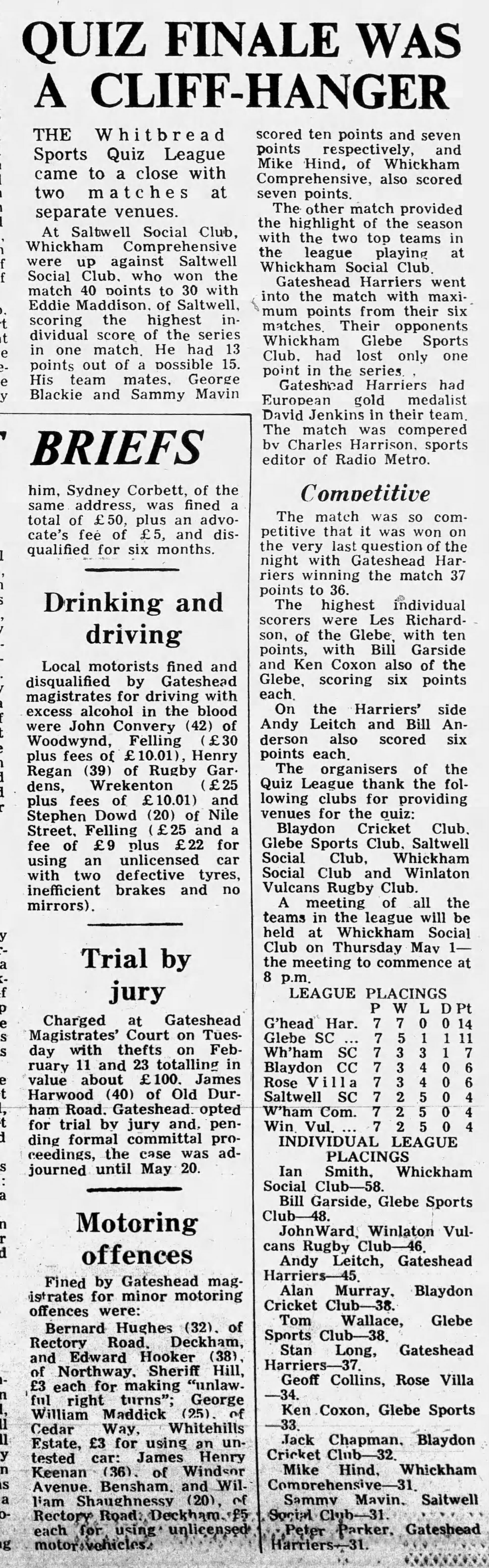 The second season saw the Whitbread Sports Quiz League, as it was then called, with two divisions of ten teams in each. This rapid growth was down to the hard work of people like Mike Hind, Jack Thomas, Ian Smith, Pete Bright, Dave Craig and Ralph Nevin - the pioneers of sports quizzing in the North-East.